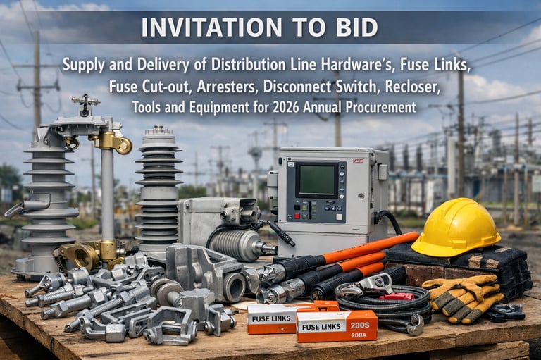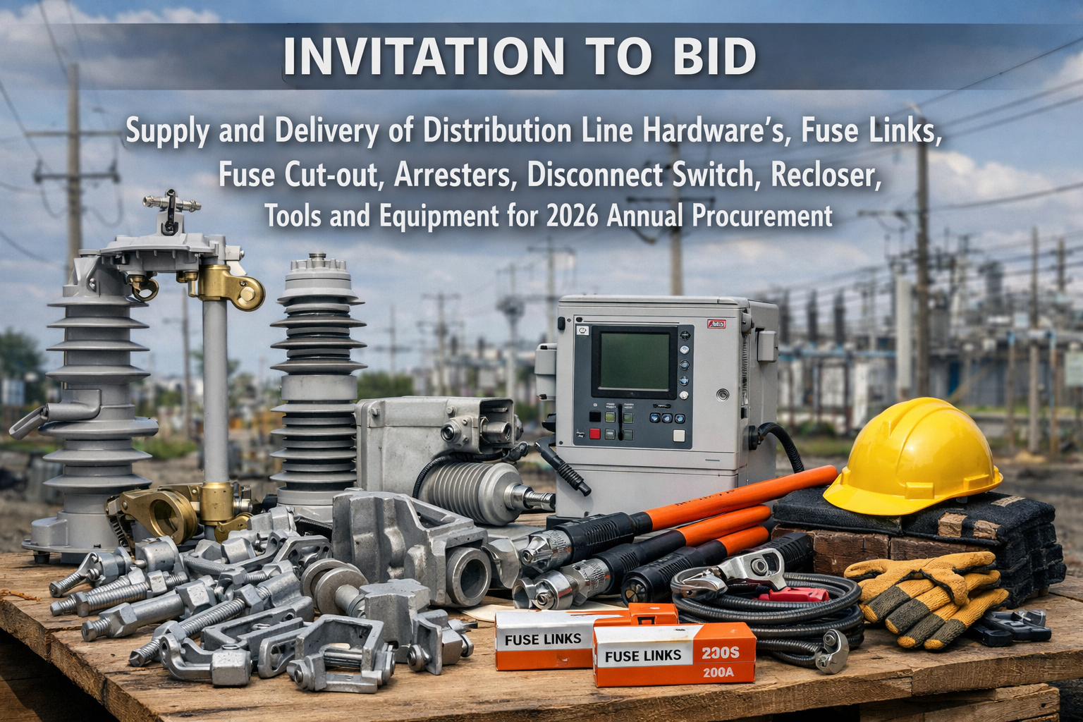 The Eastern Samar Electric Cooperative, Inc. (ESAMELCO) invites qualified suppliers to participate in the bidding for the Supply and Delivery of Distribution Line Hardware, Fuse Links, Fuse Cut-outs, Arresters, Disconnect Switches, Reclosers, Tools, and Equipment for the 2026 Annual Procurement.